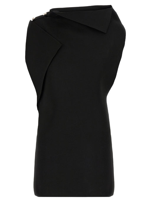 Jacquemus'la mini robe trapèze' dress in 3d effect viscose knit, Asymmetrical and draped shape, Boat neck, Sleeveless, Metal rond-carré brooch on the should...