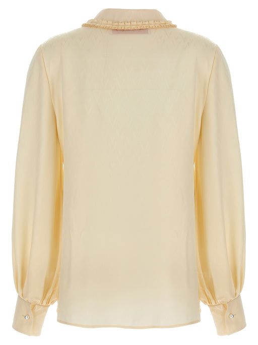Valentino GaravaniAll-over 'toute la v' jacquard silk shirt, Front and collared ruffles, Pearl button closure, Long cuffed sleeves. Size and Fit - True to size fit